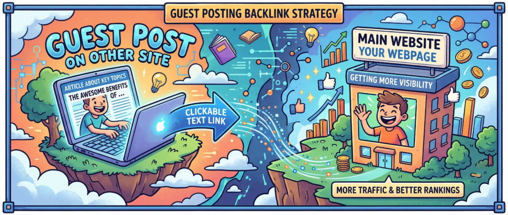 Guest posting involves writing content for another website and linking back to your own site.