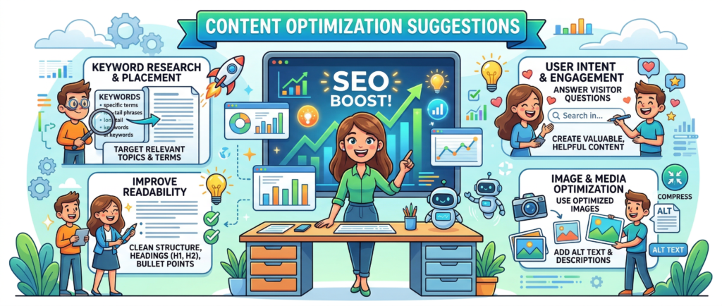 These tools analyze content and suggest improvements for: